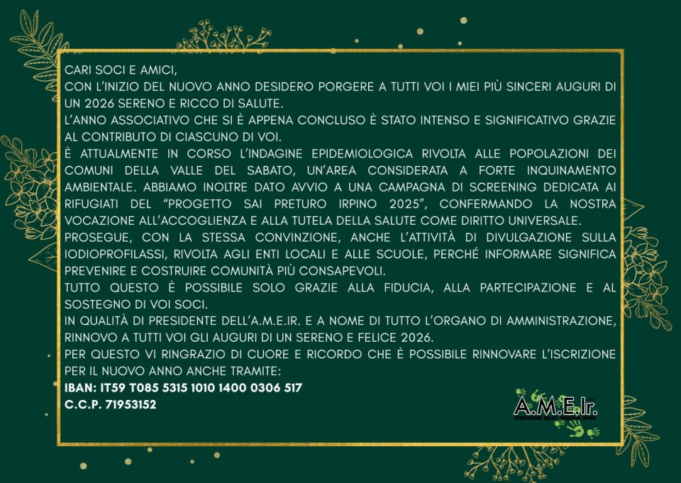A.M.E.Ir. è un’associazione Odv, senza scopo di lucro, impegnata nella sensibilizzazione delle patologie che interessano le ghiandole endocrine (come ipofisi, paratiroidi, tiroide, surrene, gonadi…) e nel supporto ai malati endocrini e ai soggetti obesi.